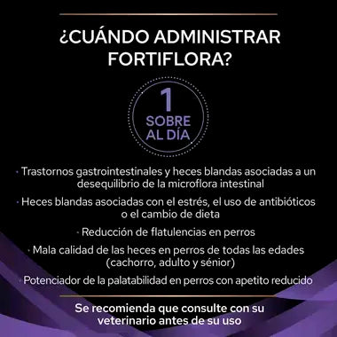 PURINA® PRO PLAN® FortiFlora® is a probiotic proven to support your pet's natural defenses. It also helps minimize gastrointestinal upset caused by stress, dietary changes, and antibiotic use, helping your pet maintain healthy bowel function and, consequently, a healtier and happier life.