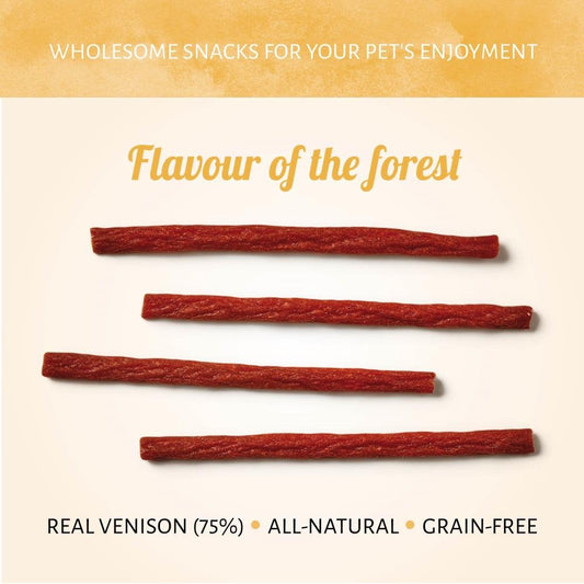 Treat you four-legged friend to the delicious taste of wild with our WILD Sticks Venison. Premium meaty dog snacks, perfect for allergy-prone dogs. This lean protein will support your dog’s muscle growth and is nutrient-rich. Made with just three ingredients, that’s it. Pure and simple. Let your dog enjoy the flavour of the forest!